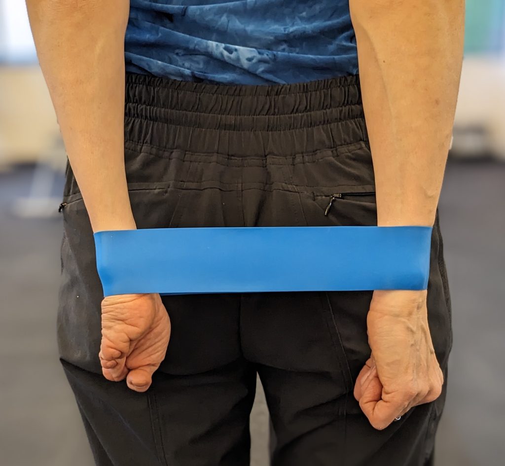Wearing the Active Hands Grip Aid on her partial hand to grasp the resistance tubing strap, Laura strengthens her shoulder by turning her forearm to the side